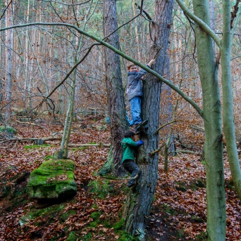 Nach Kaffee und Kuchen oder Kakao und Plätzchen, kündigte sich auch schon der Nikolaus an. Er wurde mit Gesang und Gitarrenbegleitung empfangen. Als erstes wurden Fragen über Natur und Klettersport besprochen: „Weiß denn jemand, vom welchem Baum dieser Ast stammt?“ oder „Wer kann denn einen Achtknoten machen?“ Dann kam der wichtigste Teil des Tages. Nach und nach wurden die Namen der Kinder aus einem Goldenen Buch aufgerufen und die guten oder auch weniger guten Dinge des Jahres ausgiebig besprochen. Für jedes Kind gab es auch eine kleine Überraschung vom Nikolaus. Nachdem der Nikolaus mit allen Kinder gesprochen hatte, verabschiedete er sich und ging wieder raus in den mittlerweile dunkeln Wald.