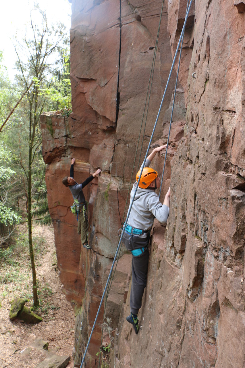 Die restlichen Tage hatten wir sehr viel Glück mit dem Wetter. Das nutzten wir natürlich aus und verbrachten die restlichen Tage damit neue Routen am Felsen zu erkunden, welche nicht immer so leicht zu meistern waren. Der Steinbruch in Ziegelberg lag mitten im Wald. Wir waren die einzigsten dort, auch sonst wirkte der Ort sehr ruhig und die Routen unscheinbar. Jedoch brachten sie den ein oder anderen schon an seine Grenzen. Am nächsten Tag kletterten wir am Fels Waldeck, welcher sich aufgrund seines Überhangs als besondere Herausforderung herausstellte. An diesem Felsen war für jeden der passende Schwierigkeitsgrad dabei. Auf dem Felsen befand sich außerdem eine kleine Burgruine, welche nicht lange unbesucht blieb. Der Fels Windstein war für manche auch schon der letzte Felsen dieser Fahrt, denn sie nahmen noch an den Rheinland-Pfalz Meisterschaften im Bouldern teil. Hier seilte sich jeder einmal selbstständig vom Felsen ab. Besonders für die „Erstabseiler“ war dies ein spannendes Erlebnis. Schnell begann auch schon der letzte Tag vor der Abreise. Diesmal lag der Felsen in der Nähe von einem Abenteuerspielplatz. Dort veranstalteten wir zuerst einen kleinen Boulderwettkampf – wer schafft es am Klettergerüst entlang zu bouldern ohne abzufallen? Dann kletterten wir am Fels bis es langsam dunkel wurde.