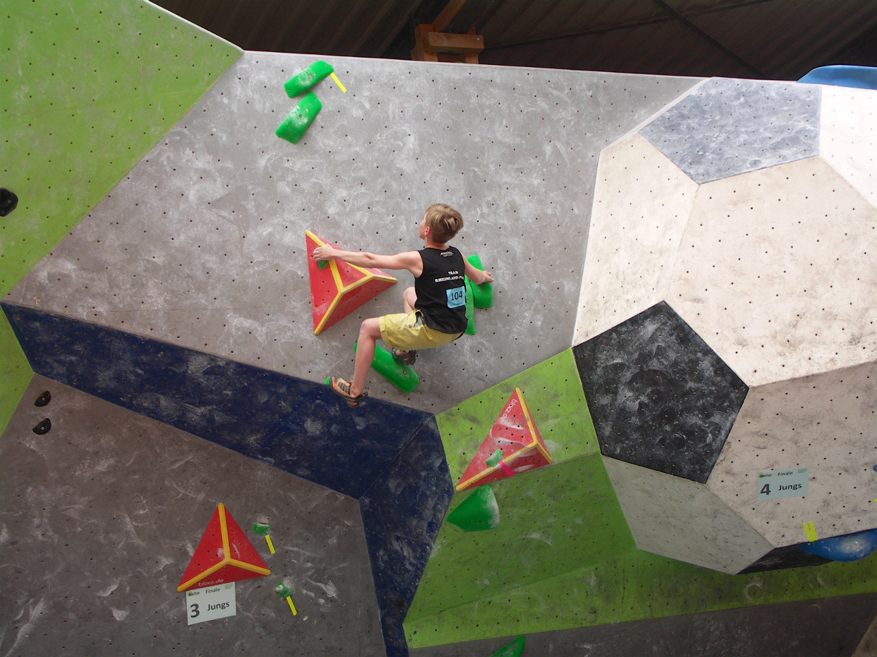 Der erste Boulder startete an einem mäßig guten Doppelgriff, gefolgt von einem Zug nach rechts in einen kleinen Seitgriff. Hier hatten schon die ersten Finalisten Schwierigkeiten sich nach dem Seitgriff so zu stabilisieren, dass sie den sehr weiten Zug zum nächsten Griff noch ausführen konnten. Till war einer der letzten in der Startreihenfolge und konnte den ersten Boulder ohne Mühe im ersten Versuch lösen. Dann hatte er wieder fünf Minuten Pause.